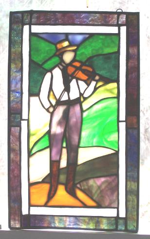 | This is an inspired fiddle player in the Appalachian highlands, enjoying a wonderful day in the sun. Kelly designed this piece as the second of a five piece bluegrass band. The piece measures about thirteen inches tall and eight inches wide. It is made from a mix of different textures and colors of glass and has two hooks for easy hanging. $375.00 including shipping |
