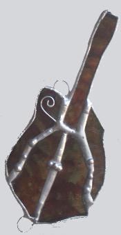 | This is a small mandolin, about three and a half inches long. It is made from a mix of different textures of brown glass and has two hooks for easy hanging. $27.00 including shipping |