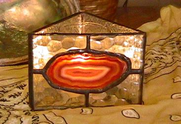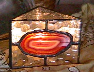 | This picture was taken with lights on in the room and the candle lit. The front is hammered clear glass for a nice sparkle. The side glass is clear iridescent. |