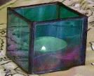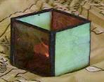 | Two Color Candle Holder - $27.00 including shipping This is a smaller, four sided style candle holder, perfect for a tea light or votive. Two sides of this piece are purple waterglass that is easy to see through and two sides are a thick, translucent green/white mix. This size piece is 2 inches by 2 inches. Shown in purple and green. Please choose colors when ordering - orders with no color choices will be purple and green. |