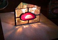 | Purple Agate Candle Holder - $52.00 including shipping This piece features a purple agate (even though the picture looks a little pink) and measures roughly 3 inches tall. Each side is about 4 inches long. The candle holder is triangular shaped and comes with a votive holder and candle. Each piece of agate is slightly different, so your piece may not look exactly like the one shown. |